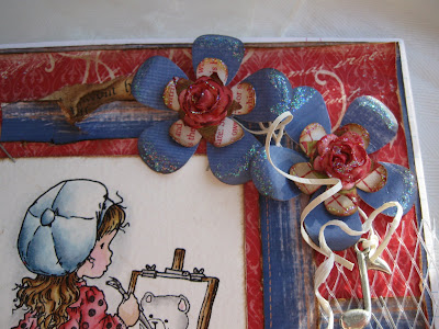 Dette motivet fra Sarah Key er så søtt! Malt med Distress Ink. Pusset og svertet alle kanter med Vintage Photo. Rosene var opprinnelig helt lyse, men jeg har sprayet dem med en blanding av vann og Distress i fargen Faded Jeans. Synes det ble kjempefin farge på dem:) Mønsterpapir er nok en gang fra Panduro, bare elsker fargen på det! Den lille sommerfuglen til venstre er forresten en charms som er bøyd til og limt på.