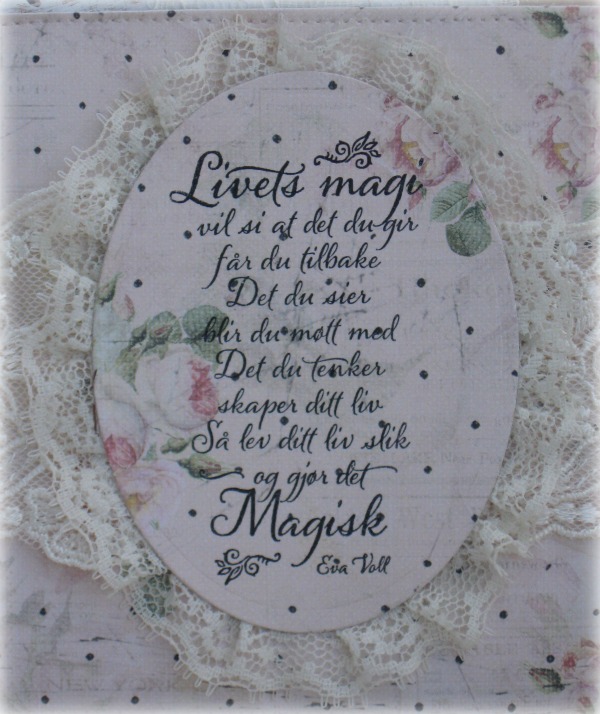 Perfect Pearls og selvlagde "frimerker" av mønsterark, pynter opp rundt motivet. Tekst fra Kort og Godt.